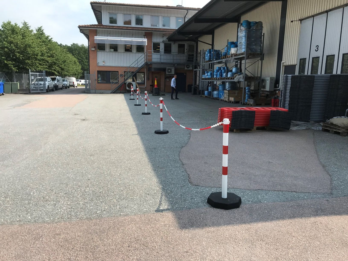 - Mångsidigt stolpe och kedjesystem är enkelt att sätta upp medan det röd/vita färgschemat drar till sig uppmärksamheten från både fotgängare och bilister.