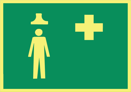 Instruktionsskylt i form av plastskylt i A5 eller A4 med budskapet "Nöddusch och första hjälpen".