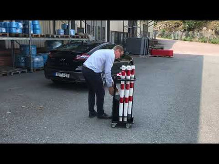 Paket som innehåller en smart vagn som gör det enkelt att förvara och flytta dina barriärstolpar. Paketet innehåller allt du behöver för att snabbt och enkelt avspärra ett område eller objekt. Vagnen levereras med stolpar, baser och kedja.