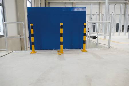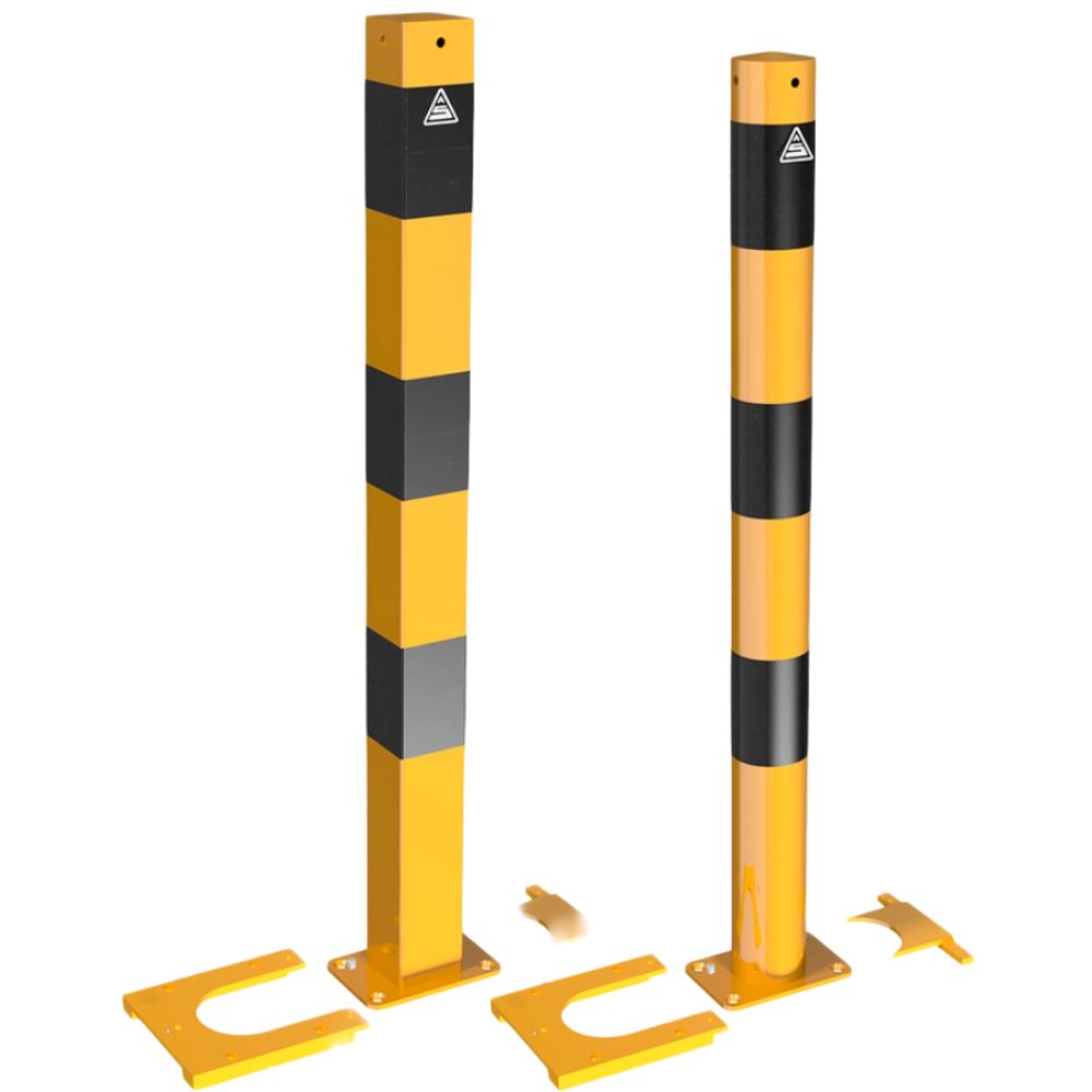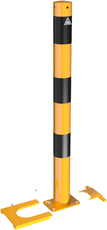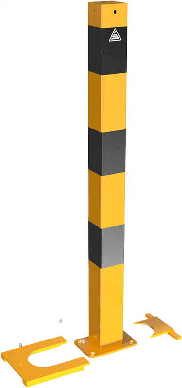 Denna gula stolpe med svarta ränder används för att markera riskzoner och avspärra områden som ska hållas fria från trafik. Stolpen fästs i den fasta golvplattan framifrån med hjälp av ett T-format stycke. Den kan dock enkelt bytas ut vid behov, eftersom endast golvplattan är permanent fastsatt i underlaget, inte själva stolpen.