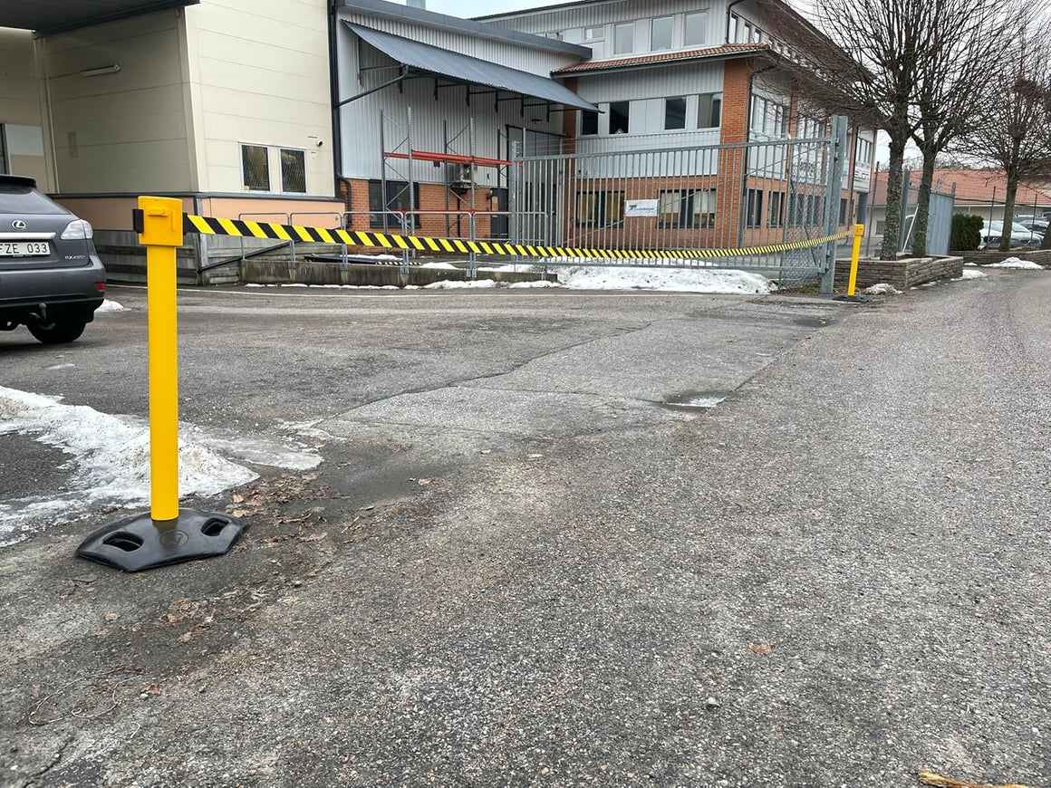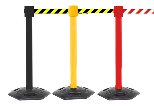 FlexiBarrier Outdoor 1050 står på en hållbar gummibas med ett handtag som gör det enkelt att flytta runt. Varje stolpe är som standard utrustad med en mottagare som gör det möjligt att fästa ett inkommande bälte från alla riktningar.