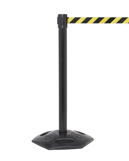 Stålbarriärstolpe utrustad med ett inbyggt, extra långt, indragbart avspärrningsband på 4,9 meter.