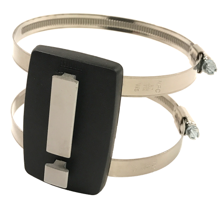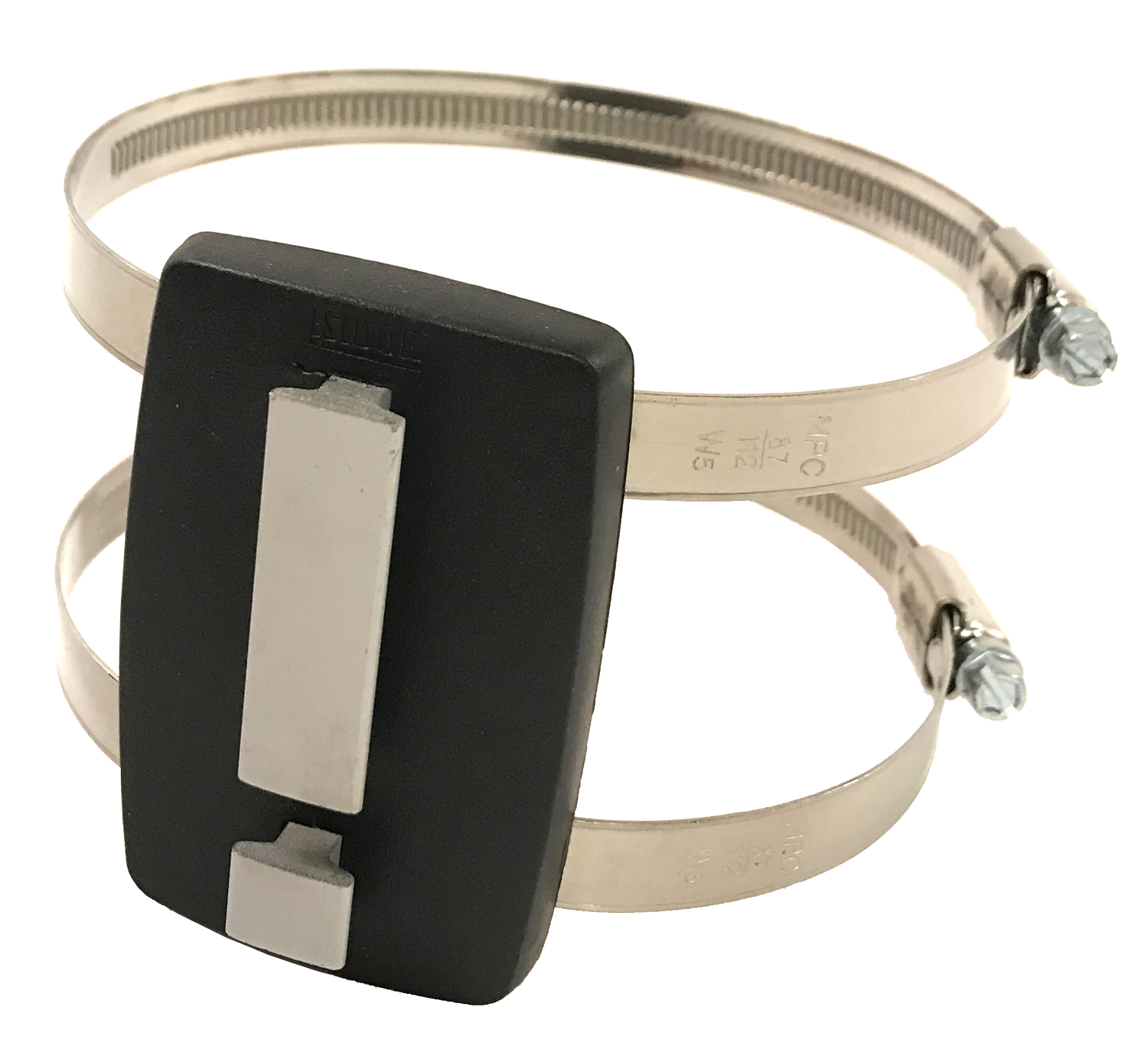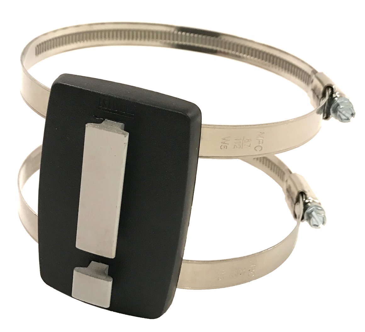 Stuprörsfäste med gördel som spänns runt röret för snabb och skonsam montering utan borrning i fasad.