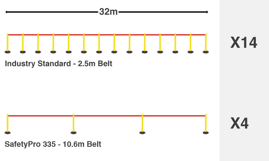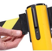 Flexibarrier SafetyPlus 10m är en bältesbarriär med ett extremt långt 10,6 meter (!) utdragbart bälte. Den integrerade utdragsmekanismen innehåller en fjäder som ser till att bältet alltid är under spänning, även om bältet inte är helt utrullat. SafetyPlus kommer med en knapp på mekanismen som kan användas för att låsa bältet.