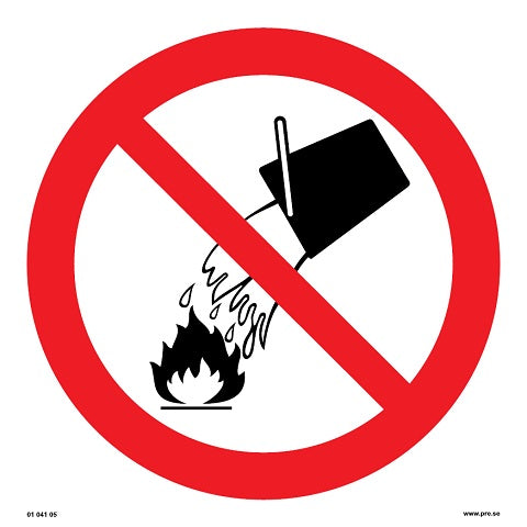 Förbudsskylt. Ej vatten för släckning i flera material och storlekar för tydlig, professionell märkning. Passar för arbetsplatser, lager, offentliga miljöer och fastigheter där tydlig information och säkerhet är viktigt.