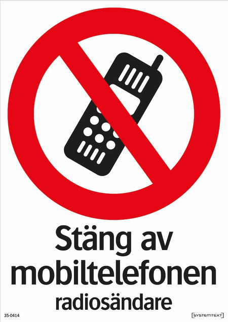 Förbudsskylt - Stäng av mobiltelefonen radiosändare i flera material och storlekar för tydlig, professionell märkning. Passar för arbetsplatser, lager, offentliga miljöer och fastigheter där tydlig information och säkerhet är viktigt.
