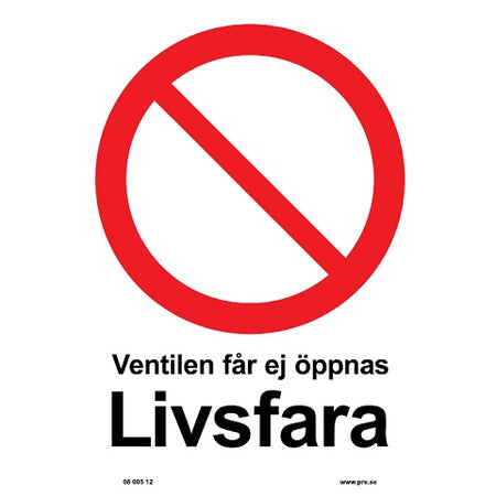Förbudsskylt. Ventilen får ej öppnas i flera material och storlekar för tydlig, professionell märkning. Passar för arbetsplatser, lager, offentliga miljöer och fastigheter där tydlig information och säkerhet är viktigt.