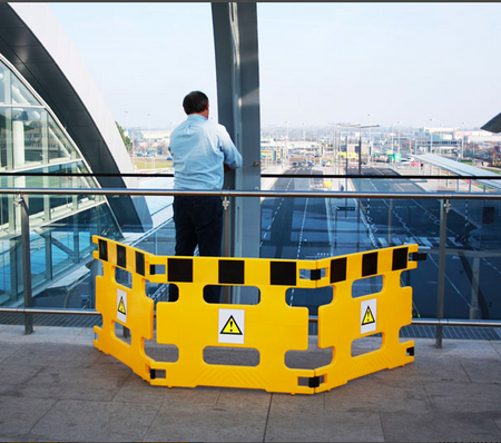HandiGard är ett högkvalitativt modulärt barriärsystem som levereras i set om 2, 3 och 4 paneler. Tillverkat av hållbar polyeten, är denna lätta säkerhetsbarriär idealisk för både inomhus- och utomhusbruk för att tillfälligt förhindra fotgängares tillträde till farliga områden. Varje panel levereras som standard med permanent gjutna grafik med varningssymbol och gula/svarta reflekterande remsor. Den släta panelytan gör rengöringen enkel. Flera säkerhetsbarriärpaneler kan kopplas ihop med hjälp av snäppgångjärn som medföljer. Sammanlänkade modulära paneler hjälper till att skapa barriärer av valfri storlek runt faror. Den har en praktisk hopfällbar design för enkel manövrering och förvaring när den inte används. Varje panels storlek: 800mm (H) x 1000mm (B) x 30mm (D).