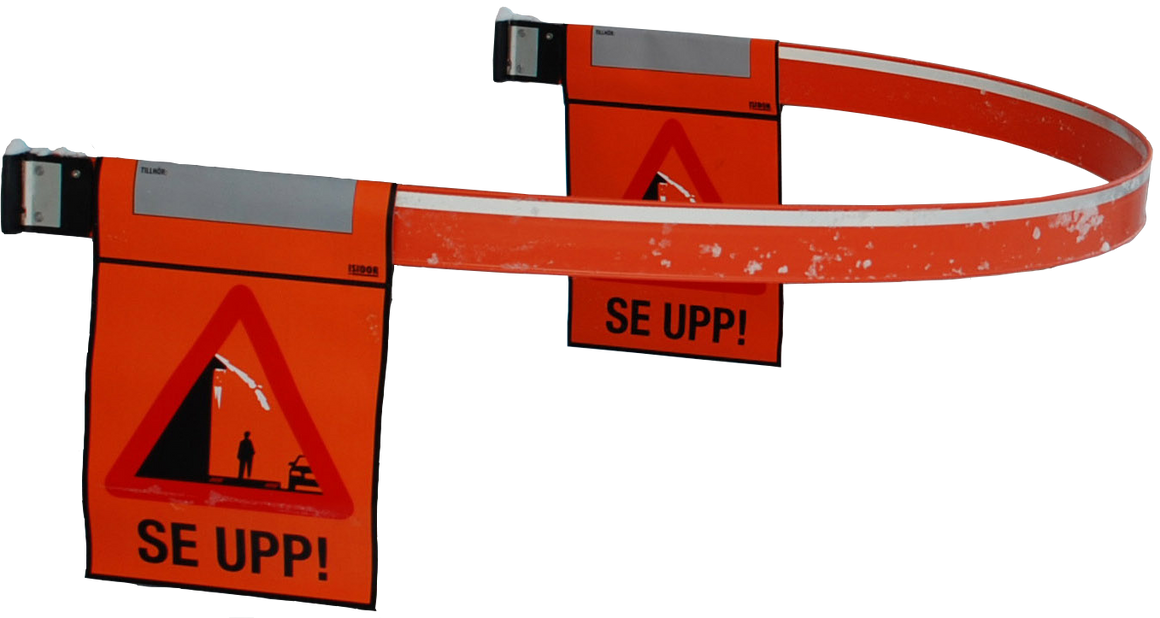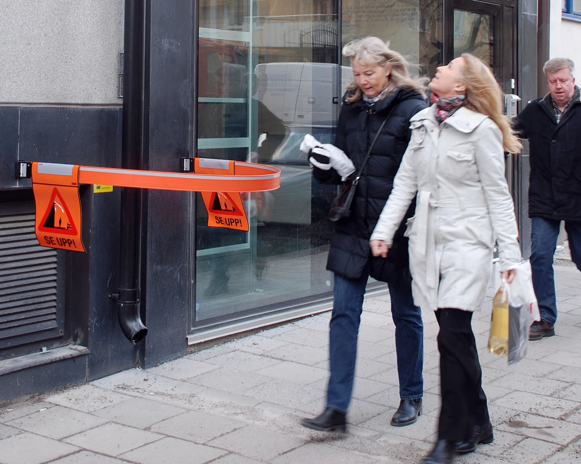 Lång, böjlig termoplastbom som varnar tydligt för snö- och isras och guidar fotgängare förbi riskområdet utan att spärra av.