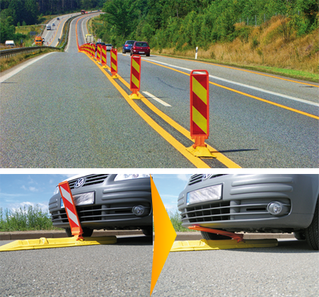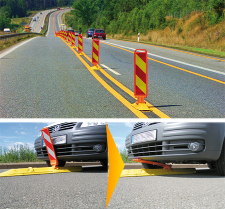 Ingen fastsättning i vägbanan behövs vilket medför att skenan kan läggas oberoende av väder. Demo video finns att tillgå, hör av er till oss! Inga färg eller limrester kvar efter avslutat jobb. Skenan läggs ut om och om igen.