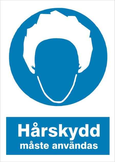 Påbudsskylt. Hårskydd måste användas. i flera material och storlekar för tydlig, professionell märkning. Passar för arbetsplatser, lager, offentliga miljöer och fastigheter där tydlig information och säkerhet är viktigt.