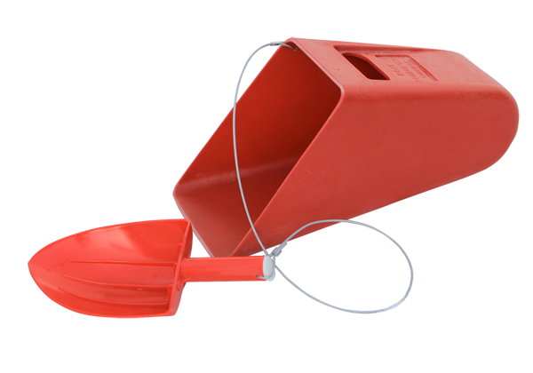 Både hinken och skopan är tillverkade av frostbeständig plast och har förstärkta handtag. Skopan är fäst vid hinken med en 1 m lång plastbelagd ståltråd, vilket säkerställer att den alltid är nära till hands.
