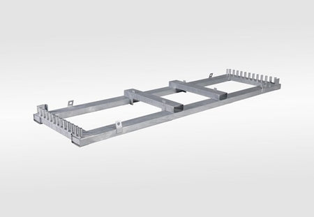 Tung transportpall av galvaniserat stål, designad för att hålla upp till 30 tillfälliga stängselpaneler (3,5 m). Byggd för effektiv lagring, hantering och transport av stängselsystem på byggarbetsplatser eller evenemangsområden.