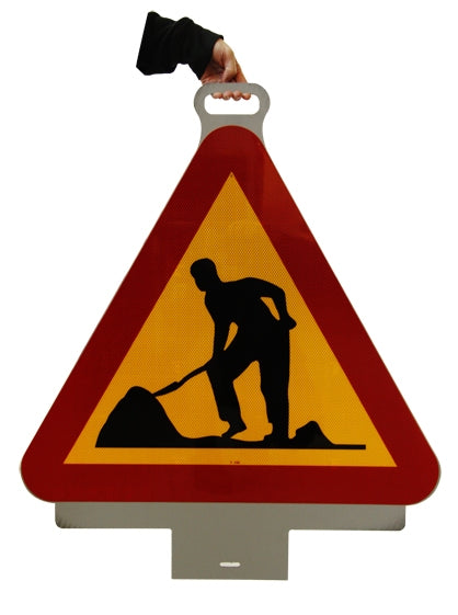 Varningsmärke i plast A20 för vägarbete – utformat för säkerhet och synlighet på arbetsplatser. Märket är försett med praktiskt handtag för enkel hantering och ett robust fäste som passar vak-upp fötter, vilket möjliggör snabb och stabil placering. Konstruerad i hållbar plast för långvarig användning under varierande väderförhållanden. Idealisk lösning för att markera arbetsområden och varna förbipasserande om pågående vägarbete.