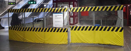 Högsynlig varningsöverdrag i gult och svart, designad för att passa standard tillfälliga stängselpaneler (2m x 3,5m). Perfekt för att öka säkerheten och synligheten på byggarbetsplatser och andra begränsade områden.