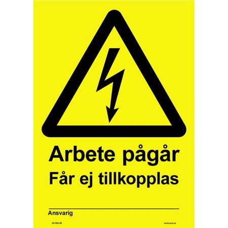 Varningsskylt. Arbete pågår i flera material och storlekar för tydlig, professionell märkning. Passar för arbetsplatser, lager, offentliga miljöer och fastigheter där tydlig information och säkerhet är viktigt.