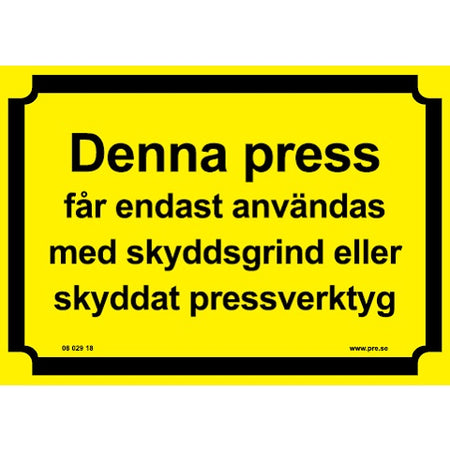 Varningsskylt. Denna press får endast användas i flera material och storlekar för tydlig, professionell märkning. Passar för arbetsplatser, lager, offentliga miljöer och fastigheter där tydlig information och säkerhet är viktigt.