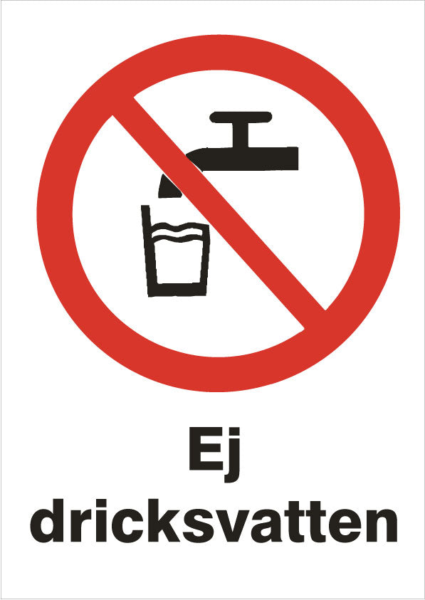 Förbudsskylt. Ej dricksvatten i flera material och storlekar för tydlig, professionell märkning. Passar för arbetsplatser, lager, offentliga miljöer och fastigheter där tydlig information och säkerhet är viktigt.