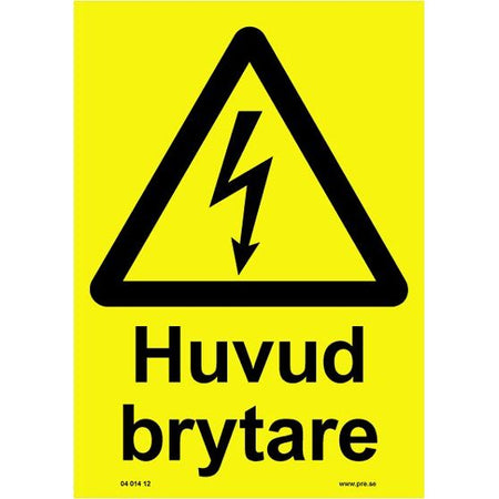 Varningsskylt. Huvudbrytare i flera material och storlekar för tydlig, professionell märkning. Passar för arbetsplatser, lager, offentliga miljöer och fastigheter där tydlig information och säkerhet är viktigt.