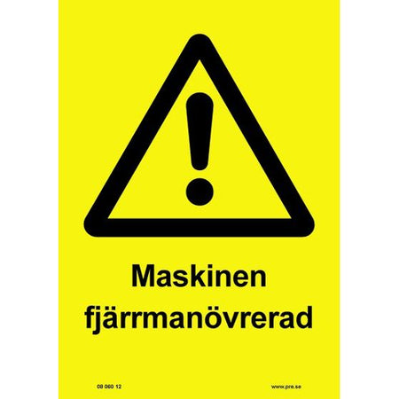 Varningsskylt. Maskinen fjärrmanövrerad i flera material och storlekar för tydlig, professionell märkning. Passar för arbetsplatser, lager, offentliga miljöer och fastigheter där tydlig information och säkerhet är viktigt.