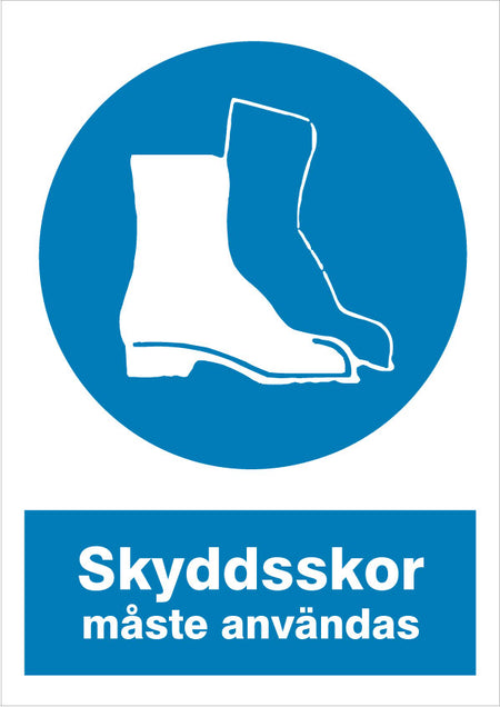 Påbudsskylt. Skyddsskor måste användas i flera material och storlekar för tydlig, professionell märkning. Passar för arbetsplatser, lager, offentliga miljöer och fastigheter där tydlig information och säkerhet är viktigt.